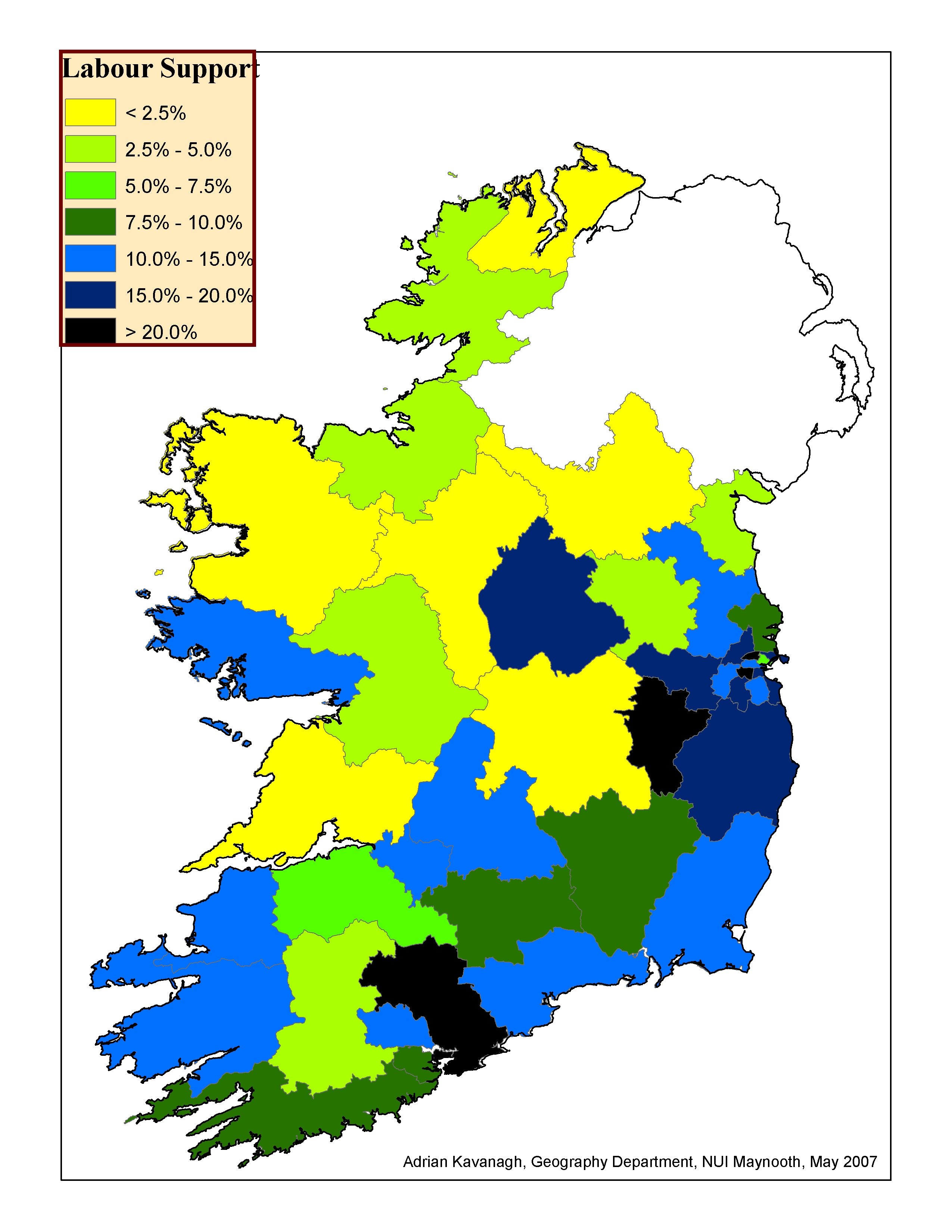Instead of me being “away off” in my estimations, it is actually your figures that are not matching up with the real situation. Based on the tally figures published in “The Kerryman” in the week after GE2007, the actual amount of votes that lost by Ferris due to the boundary changes is not 1,000, but actually just 573. No doubt related to their candidate selection for the 2007 election, it is actually Fianna Fail who would be losing the most votes – they would be down 1,149 votes due to the loss of territory to Kerry South, while Fine Gael would be down 881 votes and Labour down 205 votes. Overall, the share of the vote held by Labour and Sinn Fein would actually be slightly higher (0.3% higher) relative to Fianna Fail (down by 0.7%) in the “reduced” Kerry North component of the new Kerry North-West Limerick constituency; in the area being lost to Kerry South FF would have taken 39.5% of the vote, with FG at 30.3%, LB at 7.0% SF at 19.7%, GRN 2.0% and OTHERS at 1.4% (as against constituency results: FF 31.3%, FG 32.3%, LB 10.9%, SF 20.4%, OTH 3.2%).
