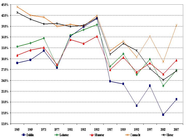Although Fine Gael support in Dublin improved (by 4.3%) in the 2007 contest, this election maintained the trend during the Ahern era of Fine Gael consistently winning less than half the amount of votes of Fianna Fail in Dublin.  Fine Gael weakness in the capital contrasts with the party’s support levels in the rest of country, but most notably in Connacht where the party outpolled Fianna Fail in the 2007 contest.  To some degree the party is almost returning to its support patterns of the mid 1960s when Connacht proved to be its strongest region relative to the rest of the state, while the party has consistently failed to gain significant tractions amongst Dublin voters in all elections since the peak of the Fitzgerald era in the early 1990s.