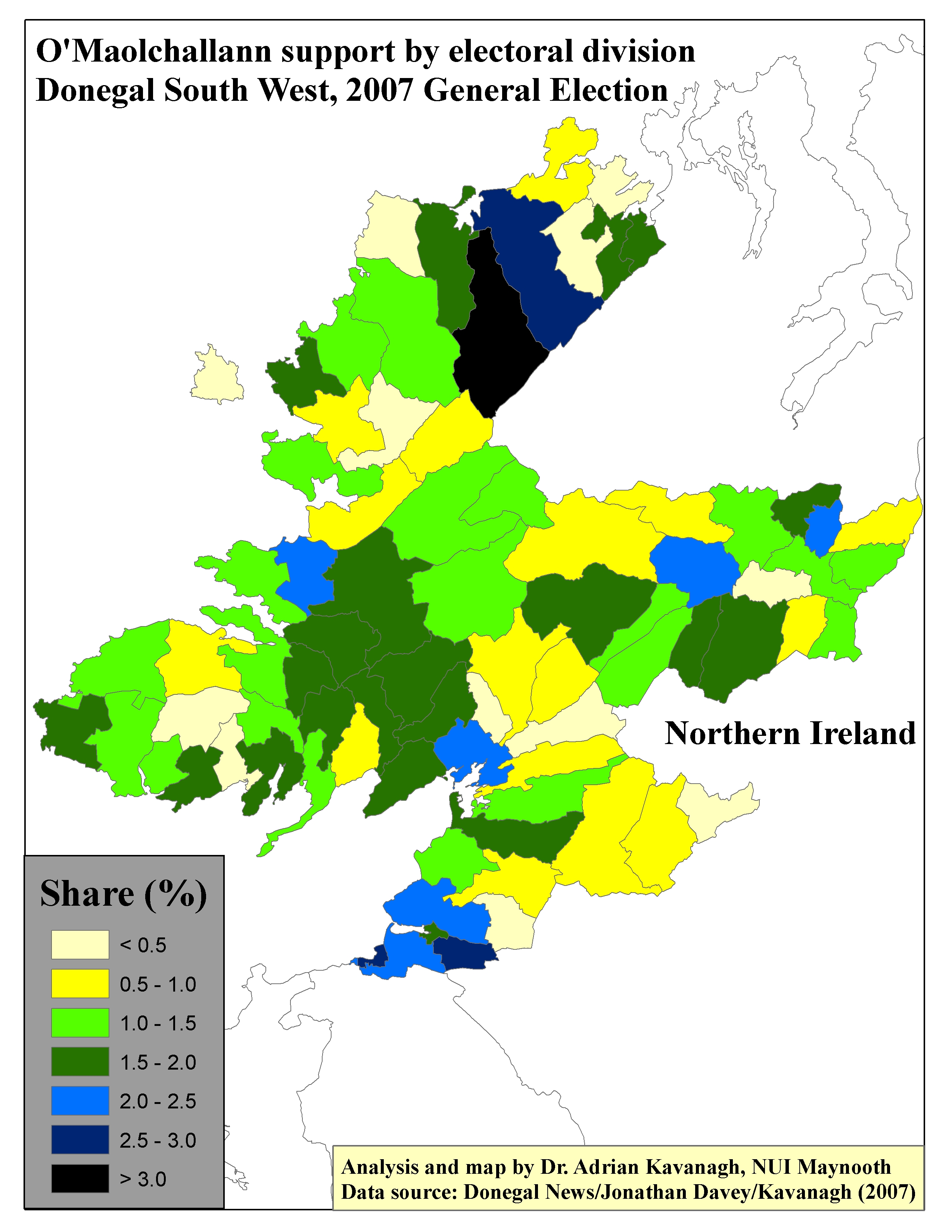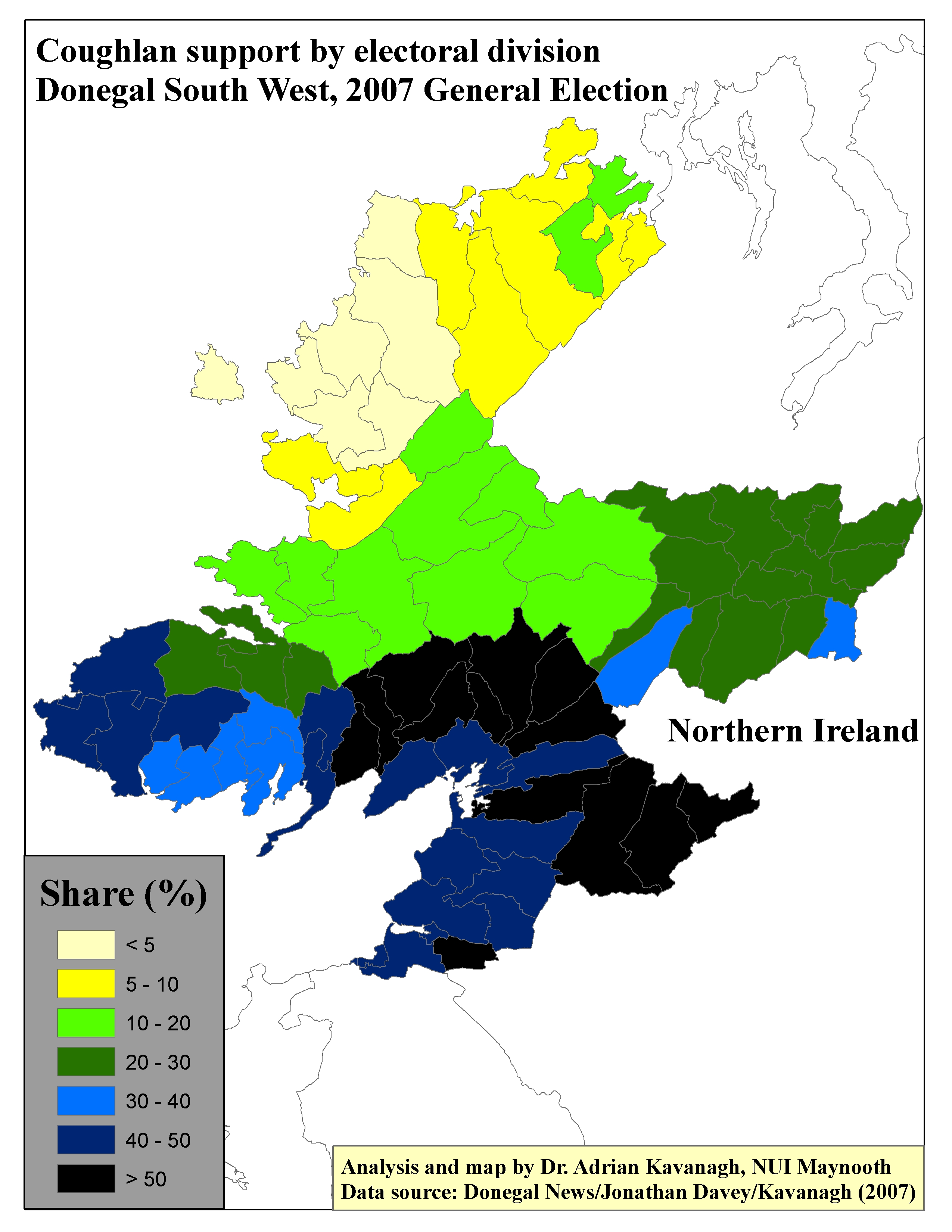 So what can be concluded from this analysis, or is this simply a case of admiring pretty patterned maps? The main lesson is that geography matters when trying to understand support patterns for parties and candidates.  A similar trend should be expected for the by-election with intense competition expected in the north-west where the bases of the main contenders (according to the poll figures and the bookies odds), Doherty and O’Domhnaill (Gortahork) are based. (Interestingly, O’Domhnaill is based in the part of the constituency where Fianna Fail support was weakest in 2007!) Both candidates would, on past support trends for their parties, be expected to poll well across most of the constituency, although the especially high levels of support enjoyed by Doherty in the Ballybofey-Lifford area in 2007 may not be as easily realised due to local competition from McBrearty (Raphoe). McBrearty, a councillor for the Stranorlar electoral area, is the only candidate to be based in the eastern part of the constituency and should be expected to poll very well in this area. O’Neill is the only one the main contenders with a base in the south of the constituency (Ballyshannon) and hence would be expected to poll strongly in this area. Thomas Pringle, an independent county councillor and former Sinn Fein member, who won 2,603 votes when he contested the 2002 General Election in the constituency,  is also based in the Donegal electoral area (in Killybegs) and might take some natural Sinn Fein votes in this area from Doherty (which may ultimately return to Doherty in later counts). The other independent candidate, Ann Sweeney, is based in Dinfanaghy in the north-eastern corner of the constituency, close to O’Domhnaill’s Gortahork base and relatively close to the Doherty Maghareclogher base.