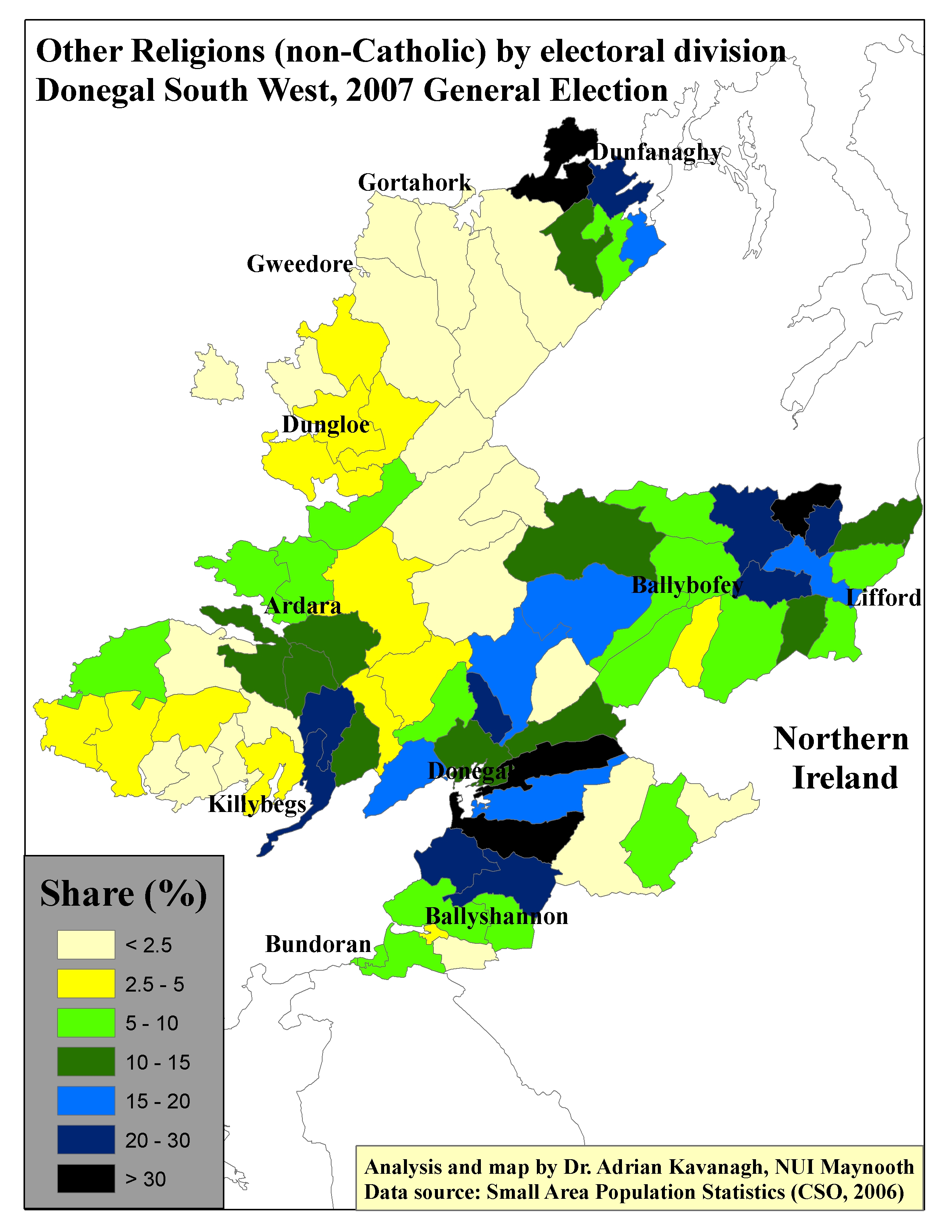 Given the traditional relationship between Fine Gael support and the non-Catholic population, the geography of the non-Catholic population (other religions: mainly in this case Protestant) provides a clue as to the higher level of Fine Gael support in the south of the constituency.