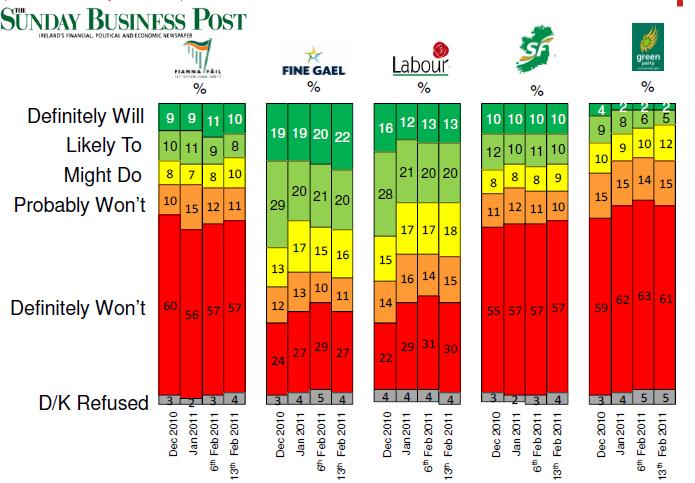 Generally, I think Labour would probably do better to ignore the threat from the left flank and tack to the centre both to attract some soft FG voters who are far more numerous than soft Sinn Fein or ULA. In addition, Labour traditionally do well (as do FG) when transfers are maximised between them. Despite the absence of a pre-election agreement many voters already appear to be planning to transfer between the two. Thus a good way to maximise transfers is for Labour to go for maximum Fine Gael transfers, both second preference and soft voters. In the last Red C poll as the chart below shows over 40% of FG voters say they will give a second preference to Labour, with an even greater percentage of Labour voters doing likewise (perhaps because they have fewer constituencies with two candidates). Given the transfer toxicity of FF, where only 20% of its own voters plan to carry on down the party list, this could have a serious impact on seats. Having difficulty uploading image so right click on little box or see second preferences table http://redcresearch.ie/wp-content/uploads/2011/02/SBP-13th-Feb-Poll-2011-Report.pdf