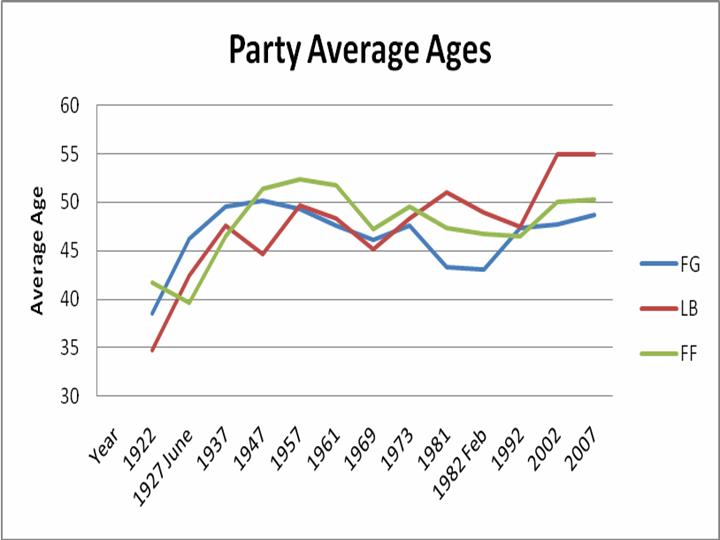 Table 2 shows the trend in ages of the three main parties, (Fianna Fail, Cumann na nGaedheal/Fine Gael, and Labour). In the early days of the state the Pro-Treaty government of 1922 was younger than the opposing Anty-Treatyites. However the average age of a TD elected for Fianna Fail in that party’s first general election in June 1927 was 39.6; this was younger than the average age for Labour TDs (42.5) and much younger than the average age for Cumann na nGaedheal TDs (46.2).