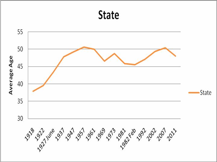 Figure 1: Average age of TDs at selected general elections, 1922-2011