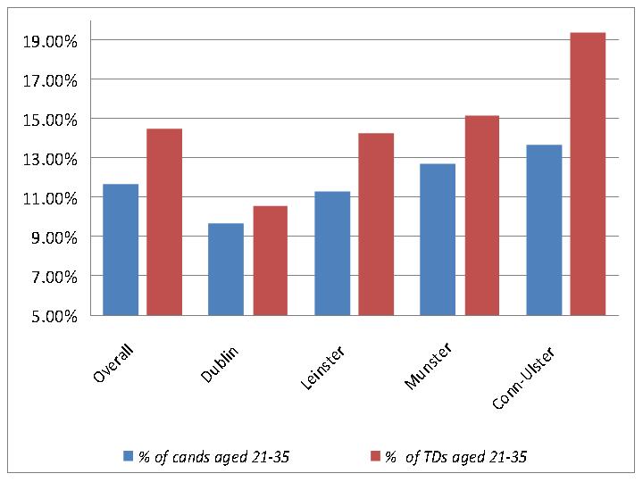 The comparisons indicate that there has been no severe overthrow of the status quo, our TDs are still by in large middle-aged. Is this because younger people did not run for election or were there a plethora of younger candidates but the public did not vote for them? Drawing on Dr. Adrian Kavanagh’s analysis of the ages of candidates we can compare the percentage of TDs between the ages of 21-35 who ran in the election, with the percentage of those who were successfully elected.