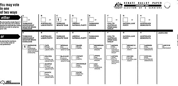 The Australian system I refer to is detailed in the sample ballot below. Each party’s list of candidates is provided in separate columns, with a thick black line separating party and candidate. Voters can choose to vote above the line in which case they indicate their parties of preference, thus approving the parties’ ranking of their respective candidates. Voters can also vote below the line for candidates, thus allocating their preferences to whichever candidate(s) they wish, thus retaining the element of intra-party choice that is lost under a closed list system.