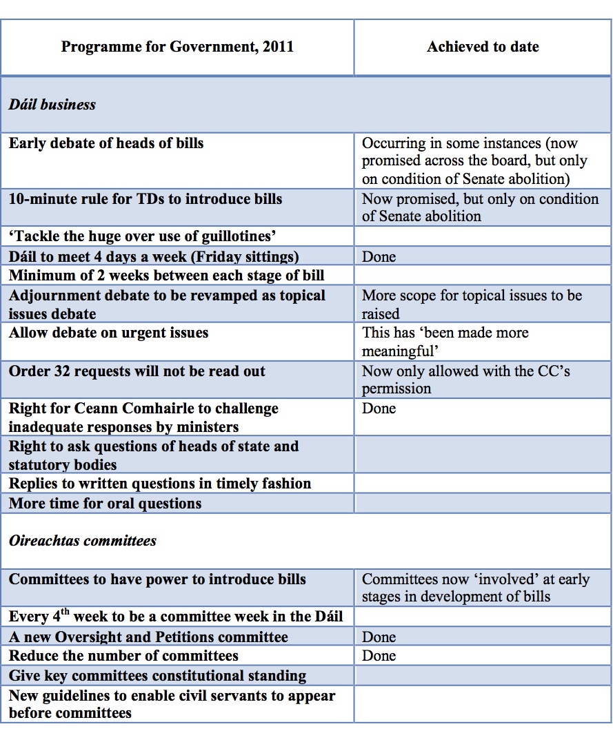 The Table below summarizes the 18 specific promises for ‘radical’ Dáil reform listed in the 2011 Programme for Government and indicates (so far as I know, and mostly based on the 2012 and 2013 government reviews of implementation) progress to date. (Note that this list does not include the proposal for Seanad abolition or the failed Abberylara referendum.)