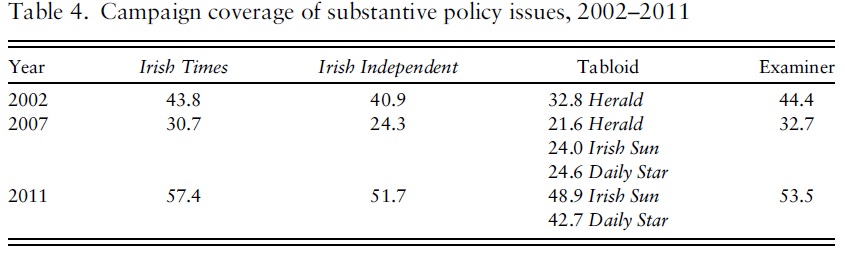 In a paper written with Heinz Brandenburg, Roddy Flynn, Iain McMenamin and Kevin Rafter that is forthcoming in European Political Science Review (an earlier version is available here) we suggest a number of media and political factors. Commercial pressures make it more difficult to produce comparatively expensive policy analysis that appeals to fewer readers. Coverage of elections as sport is cheap to produce and easy to read. The increase in opinion polling will also feed this. There is also a norm in Ireland against partisan bias, which makes covering elections as a ‘game’ preferable, because discussions of the substance of policy issues might make it more difficult for the journalist to hide any policy preferences they hold. Where there is a narrow policy space, as in Ireland, discussion of policy may seem pointless because there aren’t competing policy ideas out there. And in a majoritarian political system where there are clear winners and losers in elections, it is easier to cover elections in this way. All of which points to Ireland continuing this trend to less policy coverage.
