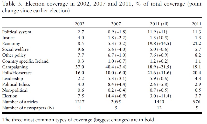 Another conclusion relates to the qualities of democracy. Sen (1999) and many others argue that democracy can prevent catastrophes because policies are observed and questioned earlier by a free press and other institutions. That the Irish press moved so firmly to cover policy in the 2011 election might support Sen’s (1999) argument. So we could have a less pessimistic outlook on the press than other commentators have had: the media can be responsive and responsible. Unfortunately this attention came too late to prevent the economic collapse as, like elsewhere, the Irish media did not discuss or question the policies that ultimately provoked the crisis.