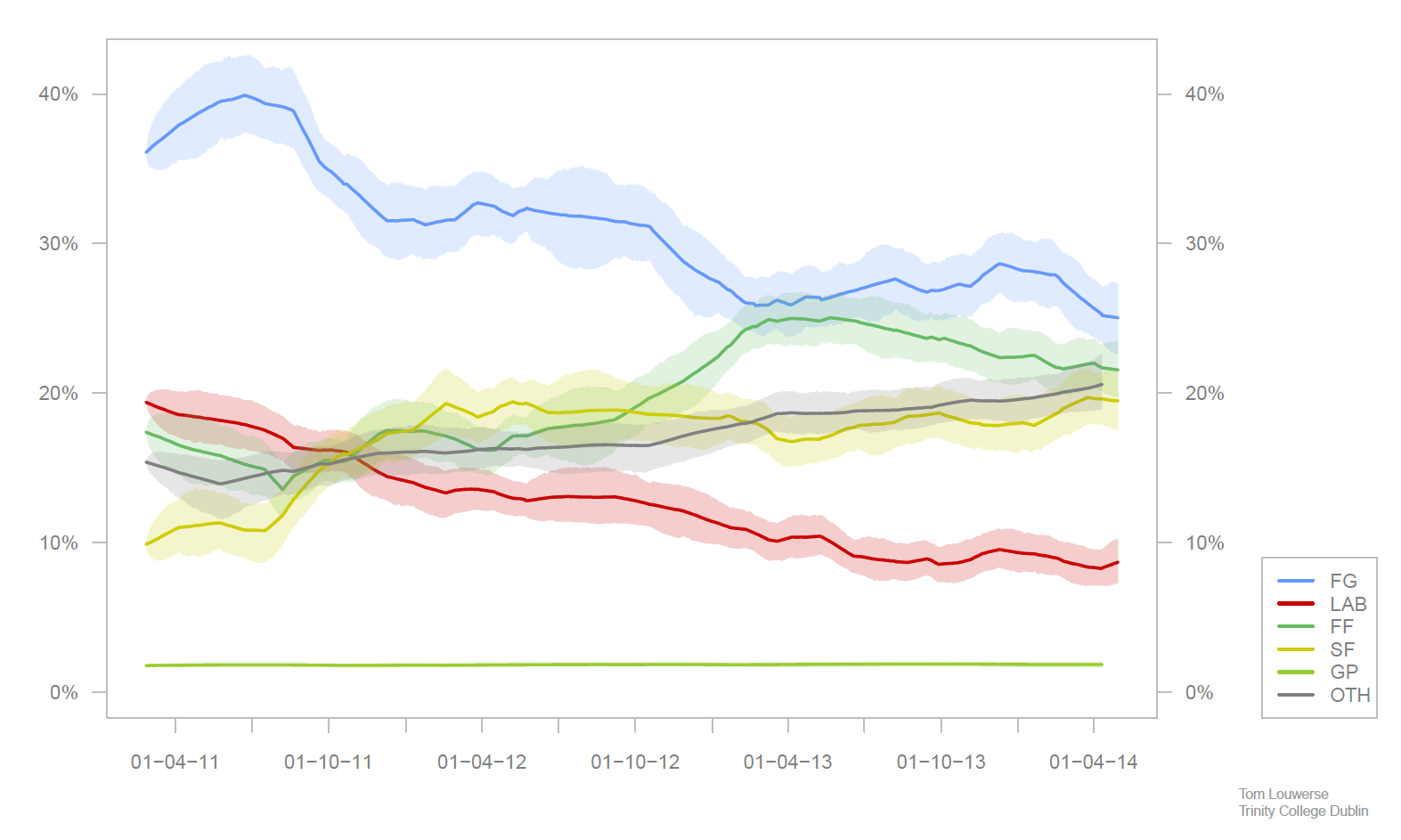 The figure above presents the Irish Polling Indicator estimates for the Irish parties since the 2011 General Election. For each party the dark line is the ‘best estimate’ while the shaded area indicates the uncertainty of the estimate. We see a decline of Labour and Fine Gael since the election, while Fianna Fáil has gained ground until about a year ago and lost slightly since. Sinn Féin and Others/Independents have mainly seen an increase in support.