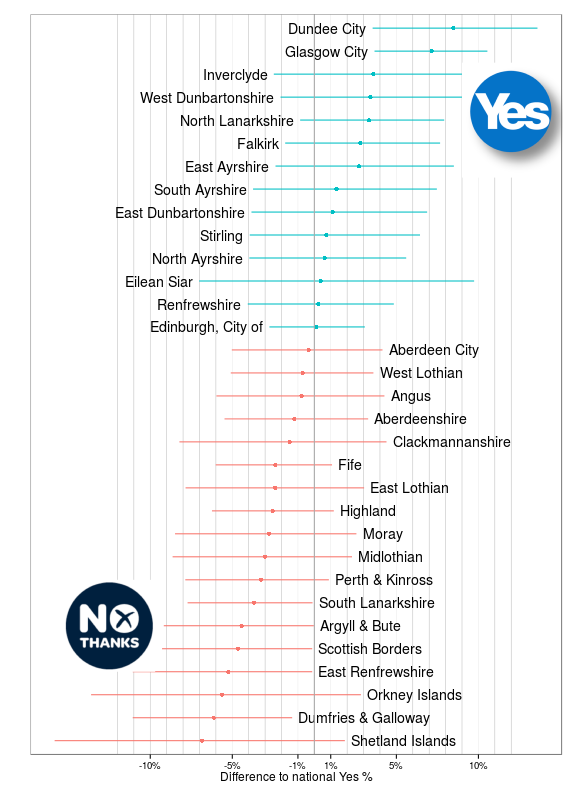 You might, of course, prefer a different result. That’s why the graph also shows the confidence intervals attached to each local authority area. Although our best guess is that the Yes vote in North Lanarkshire will be 3.3% ahead of the Yes vote nationwide, it’s most likely to be somewhere in a range between 8% ahead, and and half a percent behind. The more local authority areas report, the clearer the picture will become.difference_plot