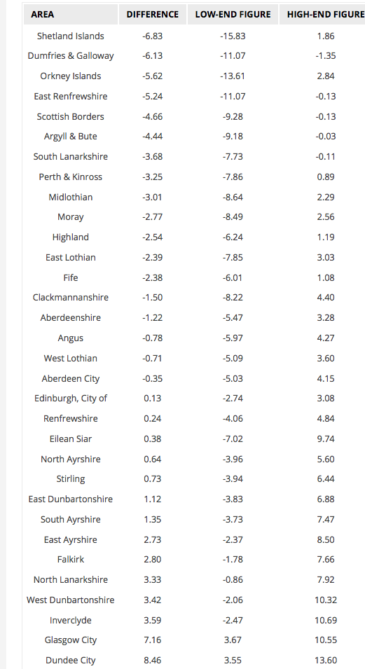 The graph below gives a figure for each of the 32 local authority areas in Scotland. (Take a look at Alasdair Rae’s blog if you’re not sure where these places are).