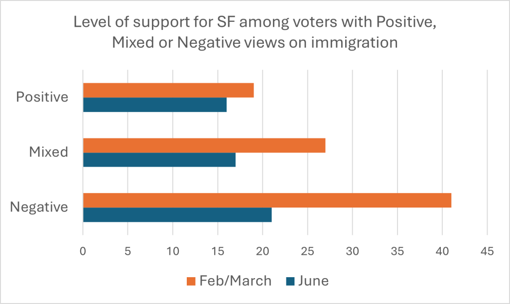 Chart 2: Between March and June, Sinn Féin support fell strongly among anti-immigration voters